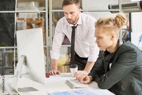 © Seventyfour, Obraz premium Portrait of handsome bearded businessman leaning over desk discussing work project with contemporary young developer coding at his computer in office
