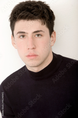 © DondykRiga, Obraz premium portrait of handsome caucasian boy looking at camera with serious expression