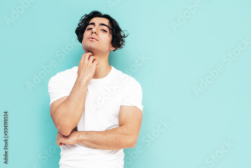 Obraz premium Portrait of handsome confident stylish hipster lambersexual model.Sexy man dressed in summer clothes. Fashion male isolated in studio. Posing near blue wall