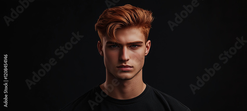 © SANASAR, Naklejka premium portrait of handsome guy in black leather jacket. fashion model
