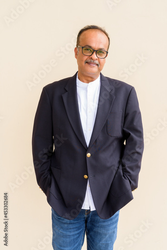 © Ranta Images, Fototapeta premium Portrait of handsome Indian businessman with mustache wearing hat against plain wall