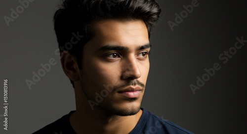 © Rafael, Naklejka premium Portrait of handsome man model with dark hair and stubble looking away studio shot professional headshot