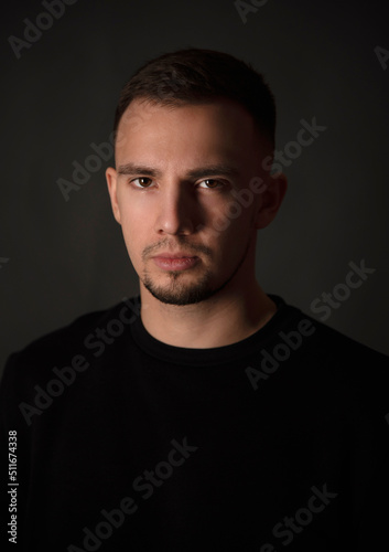 © Tetatet, Fototapeta premium portrait of handsome man sitting on chair in dark studio