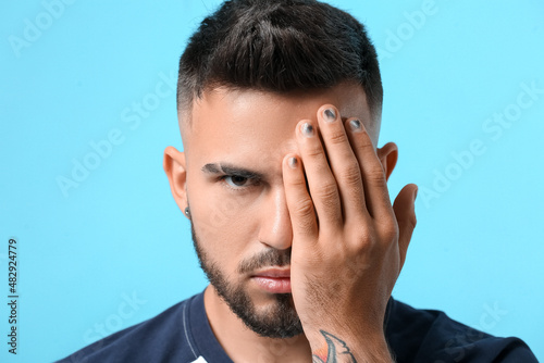 © Pixel-Shot, Fototapeta premium Portrait of handsome man with beautiful manicure on color background