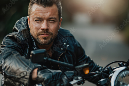 Fototapeta premium portrait of handsome man with leather jacket sitting on a motorcycle