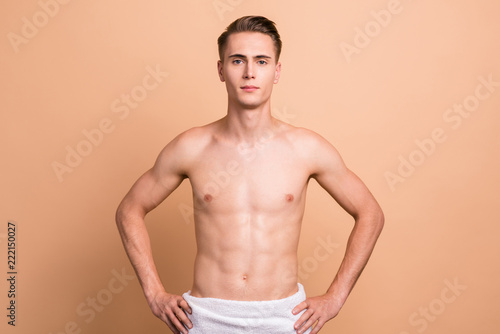 © deagreez, Fototapeta premium Portrait of handsome man with towel, naked torso, looking relax
