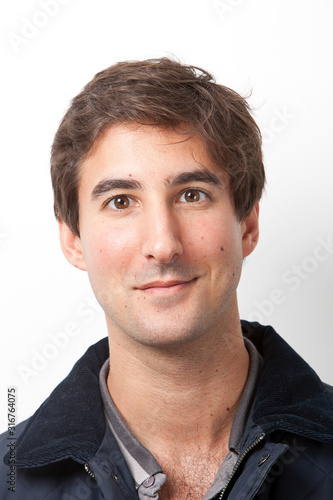 © MDBPIXS, Fototapeta premium Portrait of handsome Middle Eastern young man smiling against white background