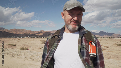 Naklejka premium portrait of handsome senior male standing on a road at desert