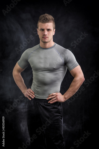© theartofphoto, Naklejka premium Portrait of handsome young man in grey t-shirt on black