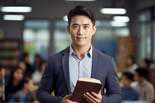 © CYBERUSS, Fototapeta premium Portrait of Happy Asian Male Teacher with a Book in School, Young Man Tutor Smiling and Looking at the Camera