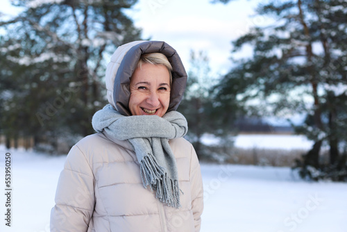 Obraz premium Portrait of happy beautiful elderly senior retired woman in age is playing, having fun with snow outdoors in forest or park at winter cold day, smiling, enjoy weather