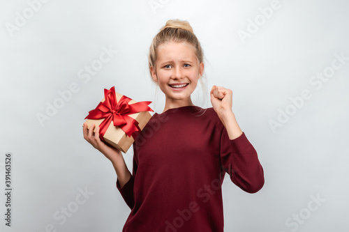 Fototapeta premium Portrait of happy blonde girl holding gift decorated with ribbon. Studio shot white background