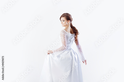 © Ulia Koltyrina, Fototapeta premium Portrait of happy bride in wedding dress, white background