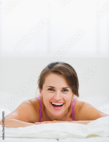 Fototapeta premium Portrait of happy girl laying on bed