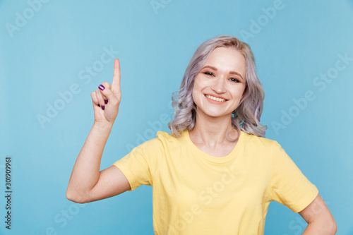 Fototapeta premium Portrait of happy girl pointing something by finger isolated