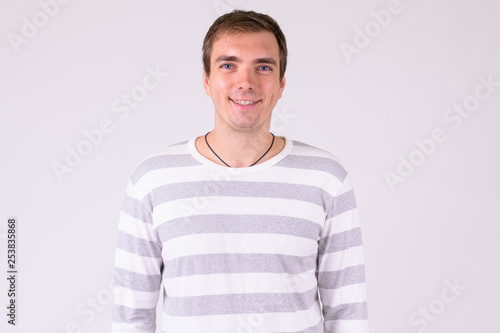 Fototapeta premium Portrait of happy man smiling against white background