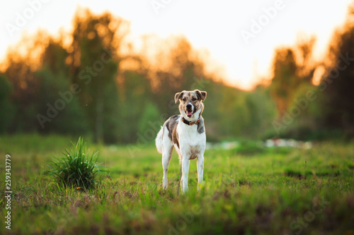 © Alexandr, Obraz premium Portrait of happy mongrel dog walking on sunny green field. Green trees background