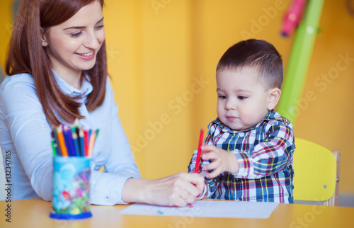 © spass, Fototapeta premium Portrait of happy pretty mother with her toddler son drawing