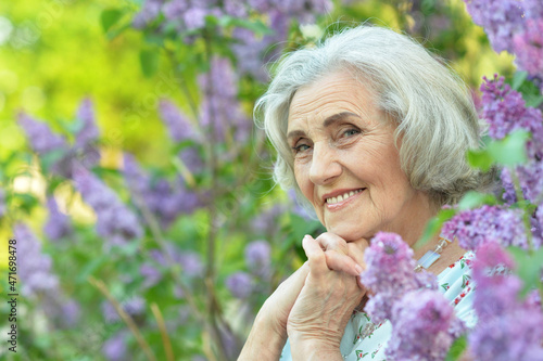 © aletia2011, Obraz premium Portrait of happy senior beautiful woman on lilacs background