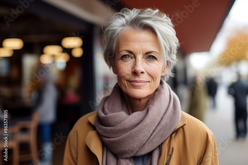 © Stocknterias, Fototapeta premium Portrait of happy senior woman walking in city street, looking at camera