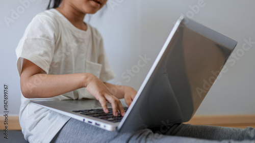 Fototapeta premium portrait of happy small pupil learning at home. Smiling little child girl enjoying doing lessons in living room. Smart kid schoolgirl looking at camera, studying remotely online.