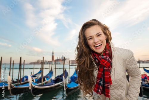 © Alliance, Fototapeta premium Portrait of happy woman traveler on embankment in Venice, Italy