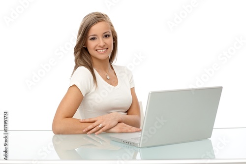 © nyul, Fototapeta premium Portrait of happy woman with laptop