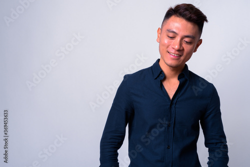 © Ranta Images, Fototapeta premium Portrait of happy young Asian businessman thinking and looking down