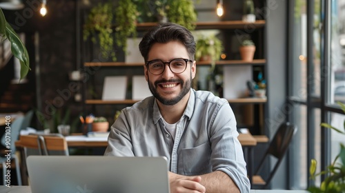 © PixelProAI, Fototapeta premium Portrait of happy young businessman working on his laptop
