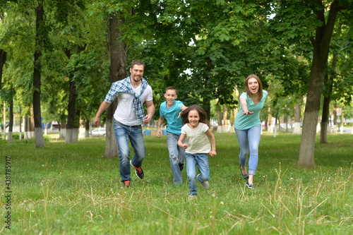 © aletia2011, Fototapeta premium Portrait of happy young family running in summer park