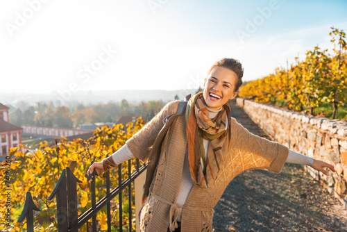 Obraz premium Portrait of happy young woman in autumn outdoors