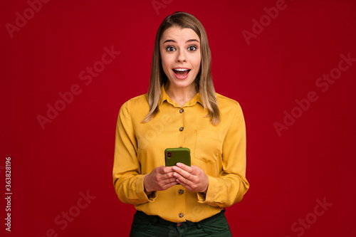 © deagreez, Fototapeta premium Portrait of her she nice attractive lovely charming amazed cheerful cheery girl using cell sale app fasts peed connection isolated over bright vivid shine vibrant red color background