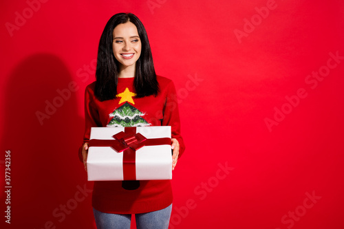 © deagreez, Fototapeta premium Portrait of her she nice attractive lovely pretty cute cheerful girl holding in hands bow ribbon giftbox looking aside copy space advert sale isolated bright vivid shine vibrant red color background