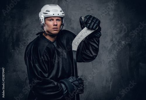 © Fxquadro, Obraz premium Portrait of hockey player with the gaming stick.