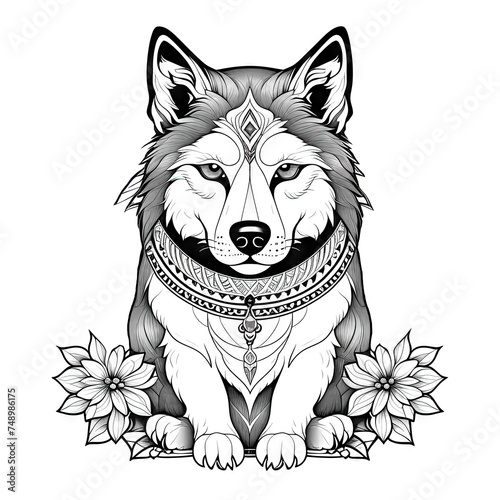 © Svetlana, Naklejka premium Portrait of husky in grayscale, tattoo, pattern for coloring book. Art Nouveau style, isolated on a white background.