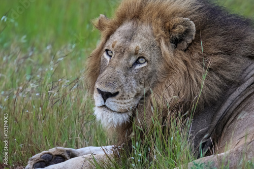 Fototapeta premium Portrait of impressive male Lion resting in the grass, Kruger National Park,...