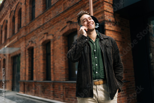 Naklejka premium Portrait of joyful young man happily talking on smartphone while walking near brick building, enjoying conversation and urban atmosphere. Concept of modern successful city lifestyle.