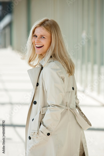 Fototapeta premium Portrait of laughing blond woman wearing trench coat