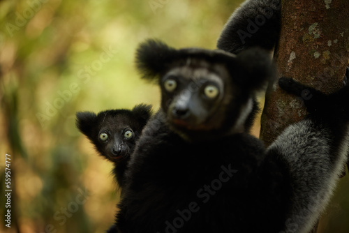 © Martin Mecnarowski, Fototapeta premium Portrait of Lemur Indri, mother and baby. Largest lemur from Madagascar in ist natural envirnoment of rainforest. Travel to Madagascar wilderness.