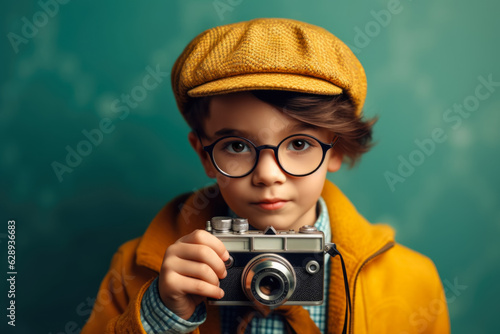 Obraz premium Portrait of little kid boy in glasses with camera in retro style on blue...