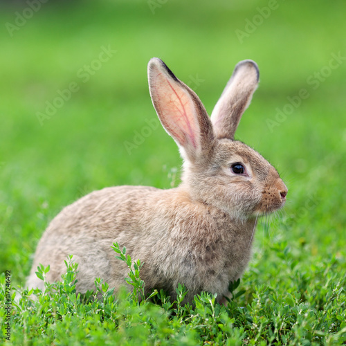© rimmdream, Fototapeta premium Portrait of little rabbit on green grass background