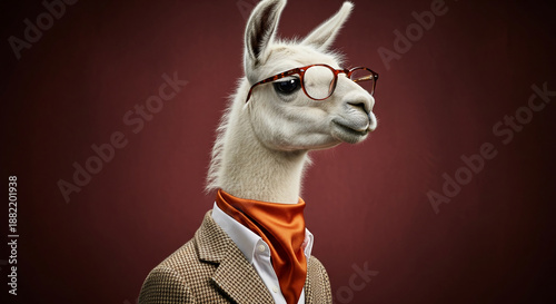 © PhotoArtHub, Fototapeta premium Portrait of llama with glasses and tweed jacket, on a solid background, representing elegance, sophistication, and unconventional style