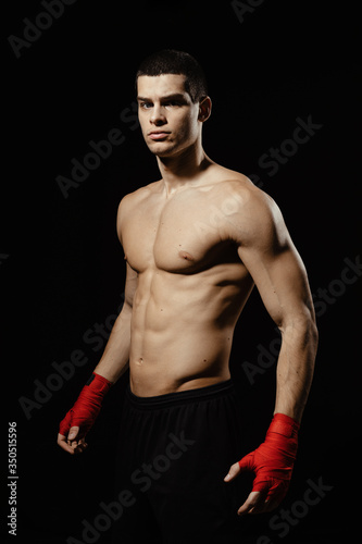 Naklejka premium Portrait of male boxer posing in boxing stance against black background.
