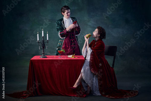 © master1305, Fototapeta premium Portrait of man and woman in image of vampires over dark green background. Man taking selfie of woman eating burger