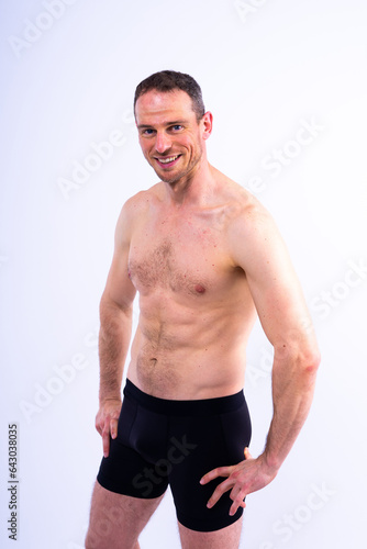 © Ivan Zelenin, Fototapeta premium Portrait of man, bodybuilder and bicep flex in studio, background and exercise for muscular power.