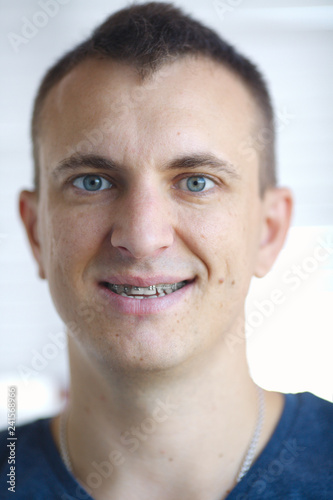 © Aleksandr, Fototapeta premium Portrait of man with crooked white ugly teeth close-up. Dental braces on the teeth in dentistry. Orthodontics and bite correction. Terrible smile. Problem, care and toothache