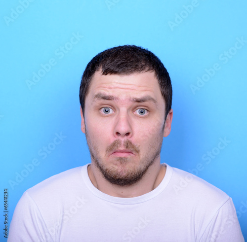 Obraz premium Portrait of man with dusgusted gesture against blue background