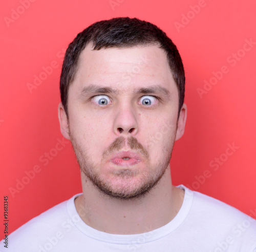 © irishmaster, Obraz premium Portrait of man with funny face against red background