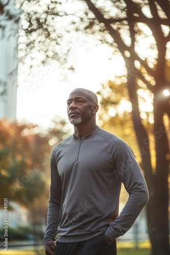 © Lana Milanovic, Obraz premium Portrait of mature african american man prepare for jogging in park