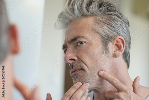 Fototapeta premium Portrait of mature handsome man looking in mirror at home